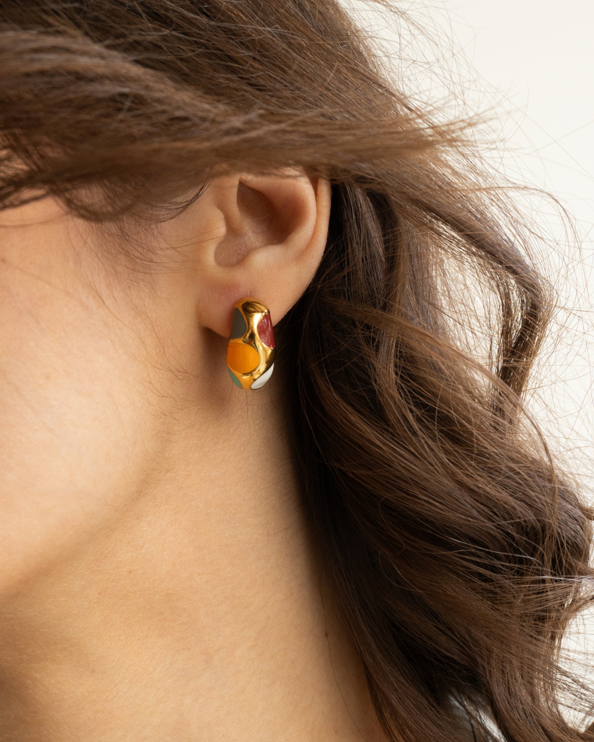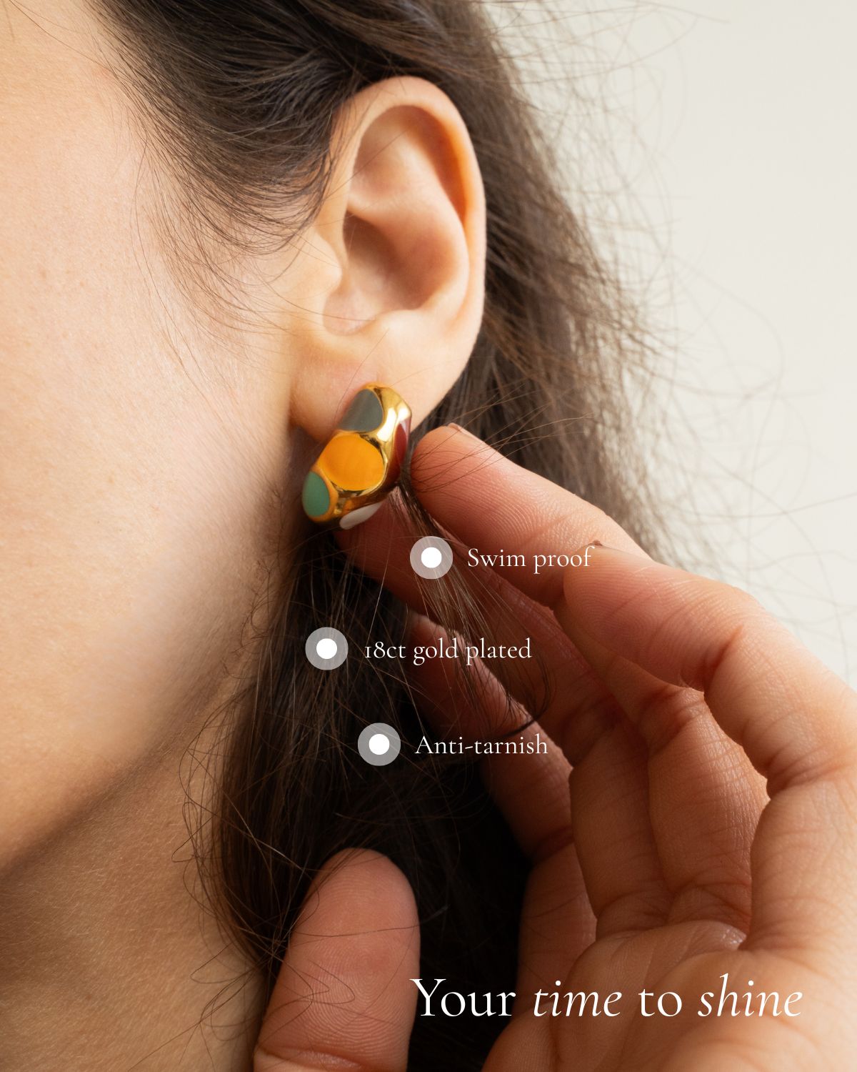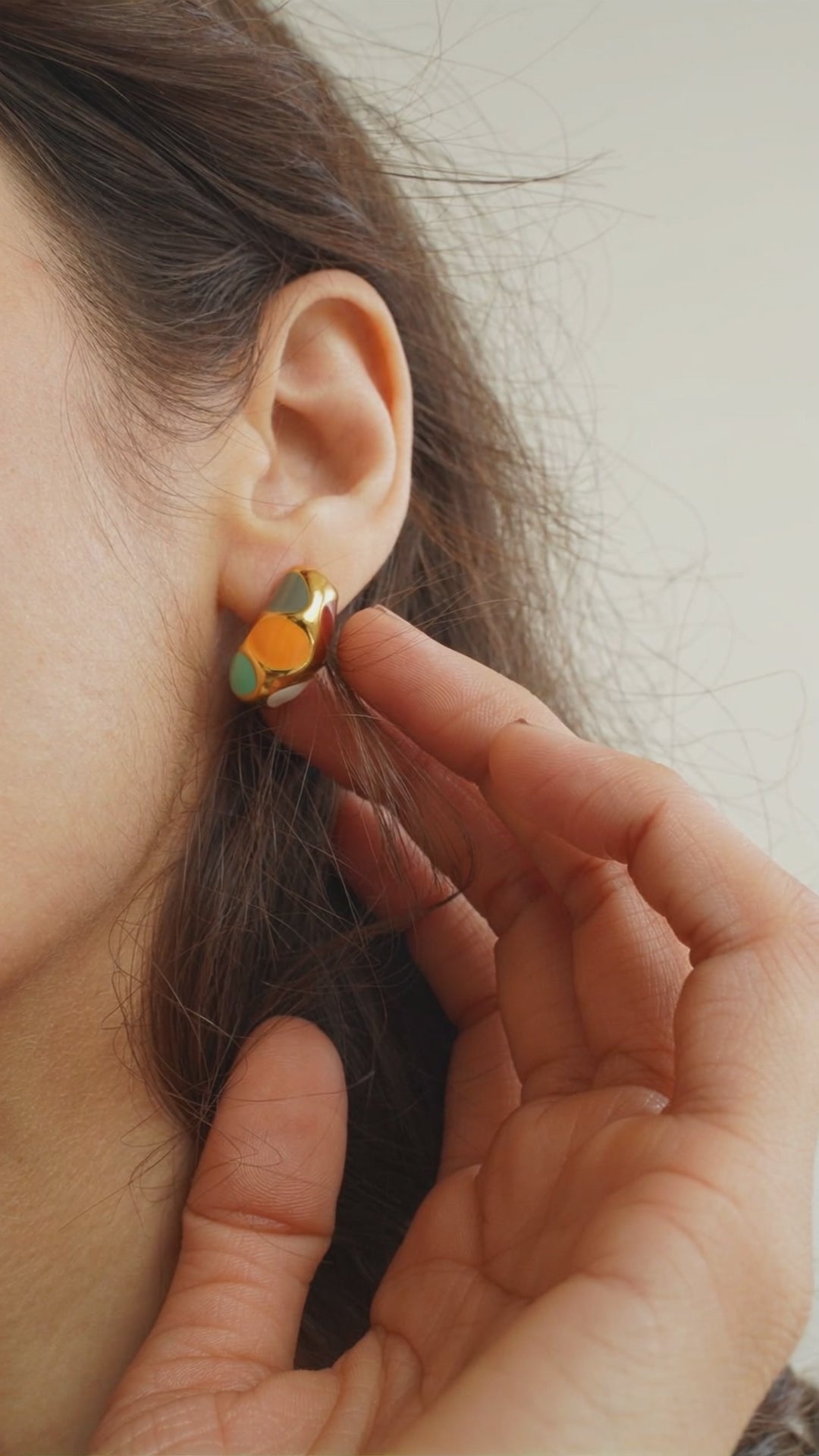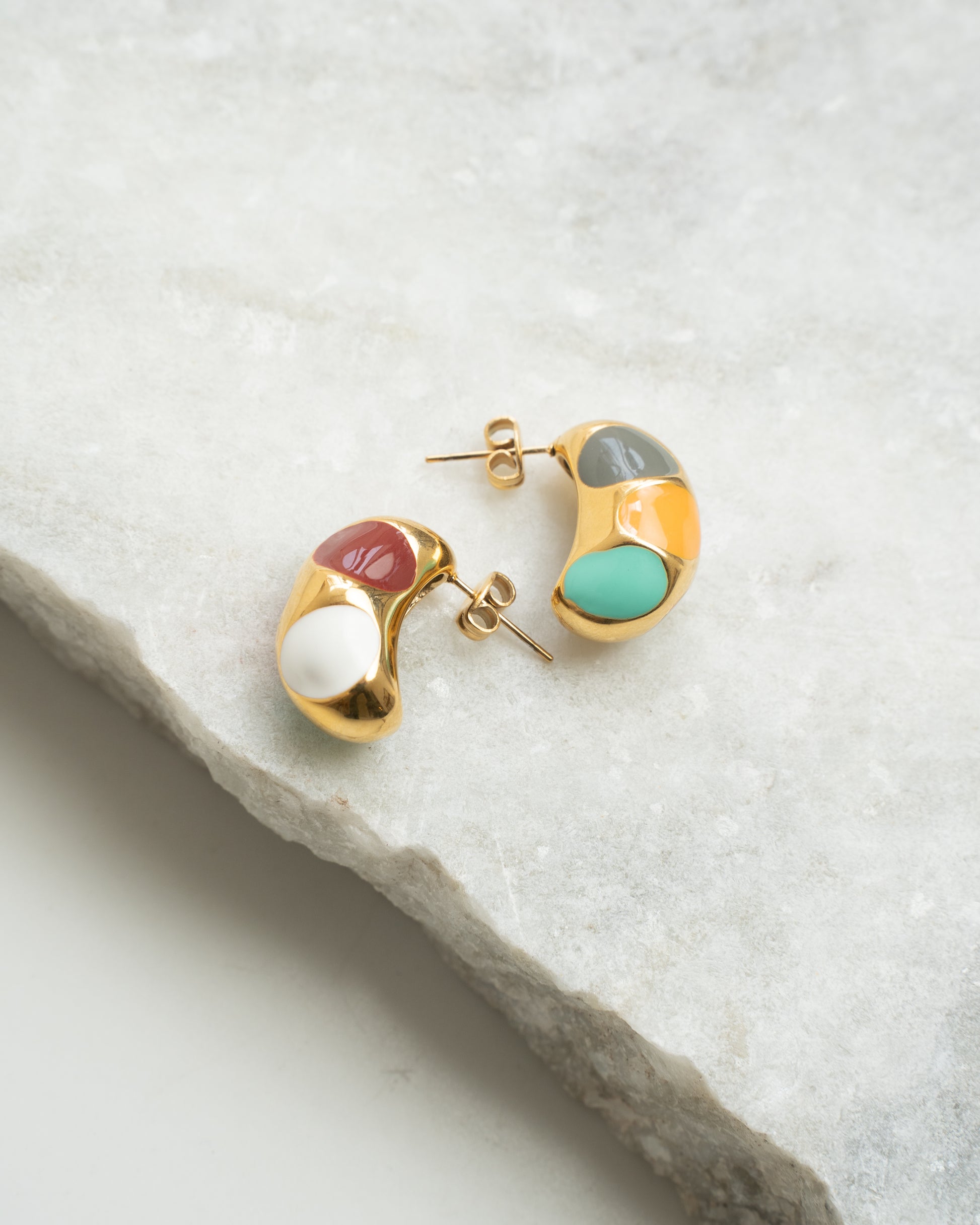 The bean studs feature assymetric splashes of multi color enamel. Crafted to squeeze in a compliment from your mom about how dainty these look.