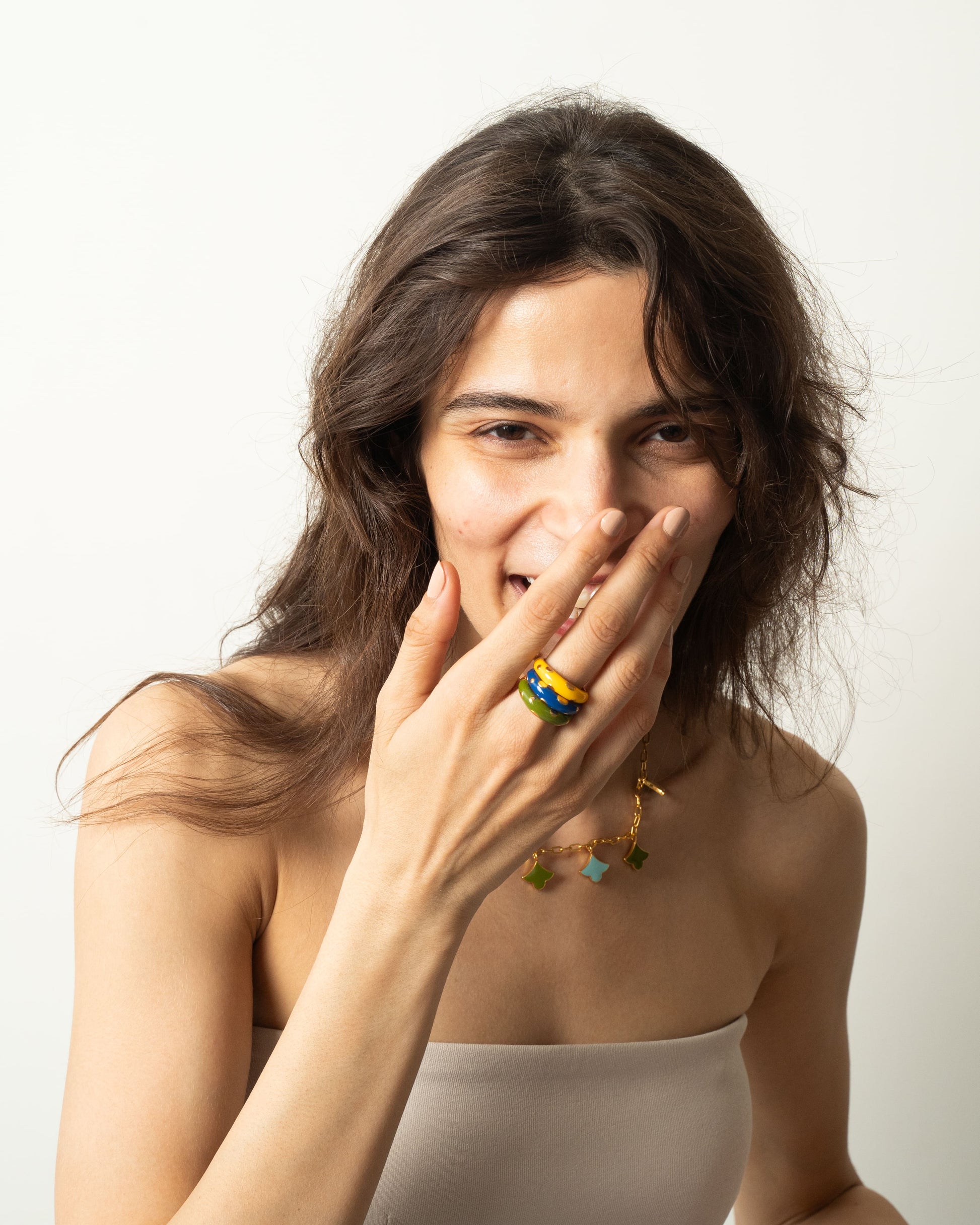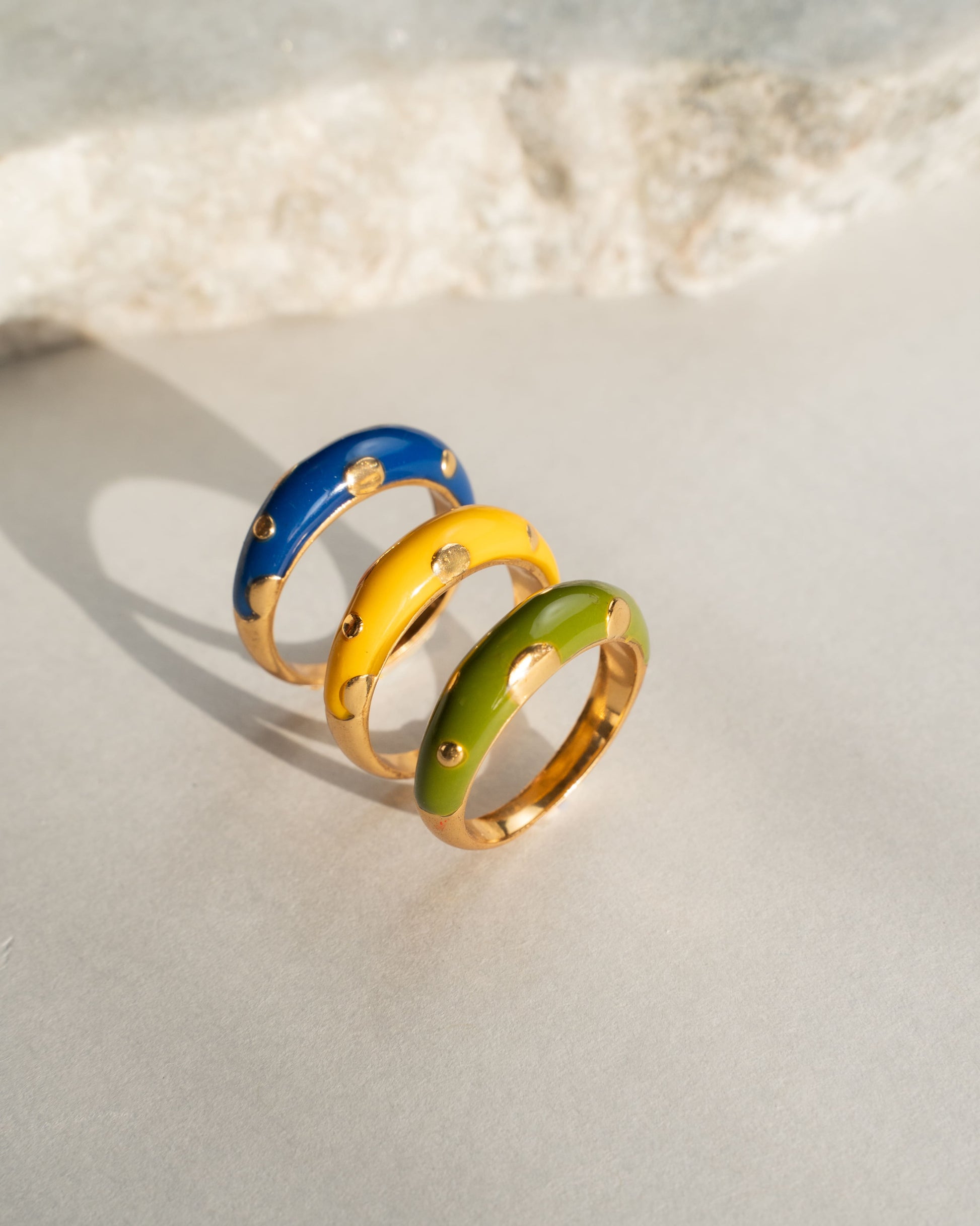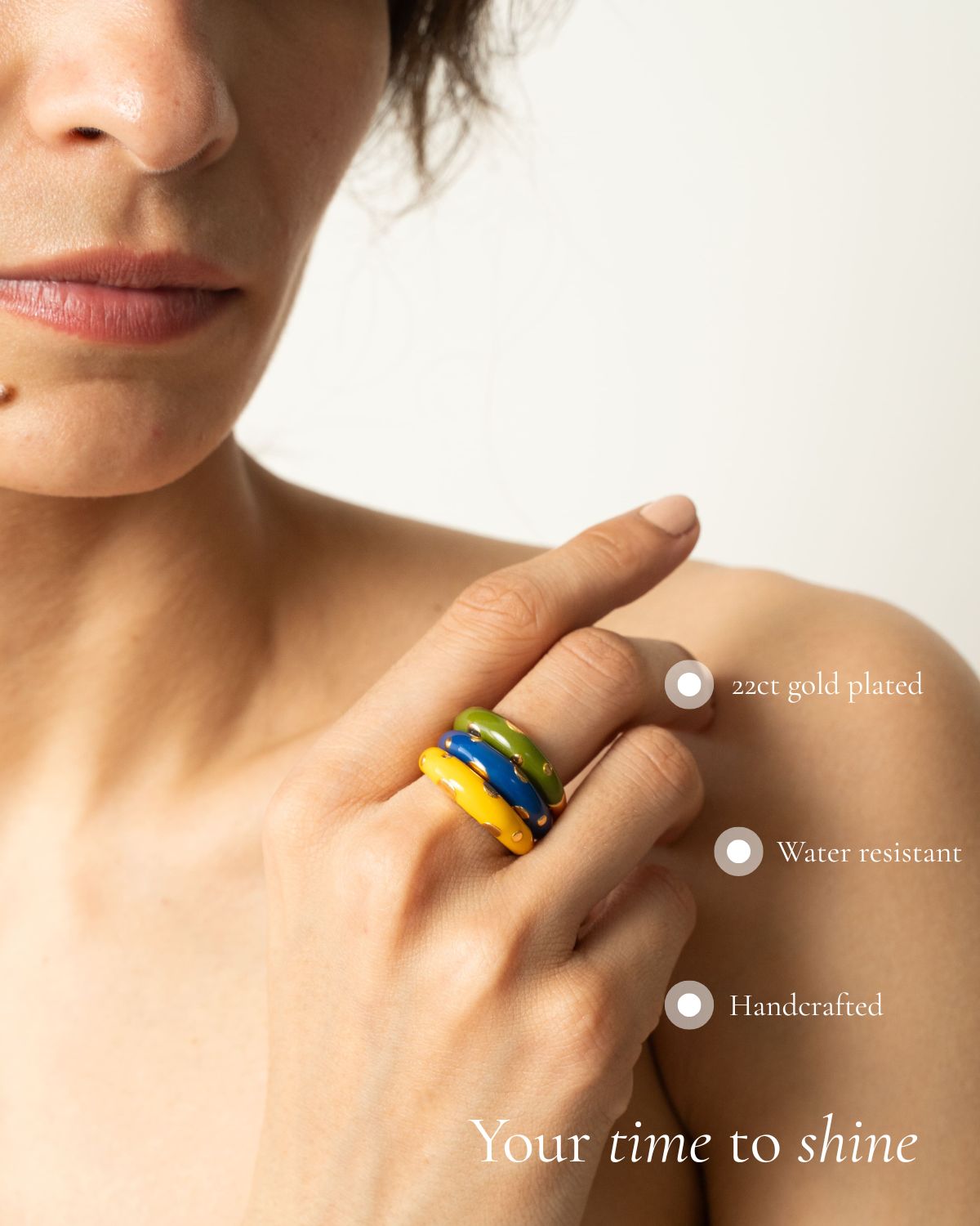 Each piece is handcrafted by our artisans in high-grade brass. Our rings are handcrafted in modern meenakari and come packaged in our signature gift box, making it the perfect gift.