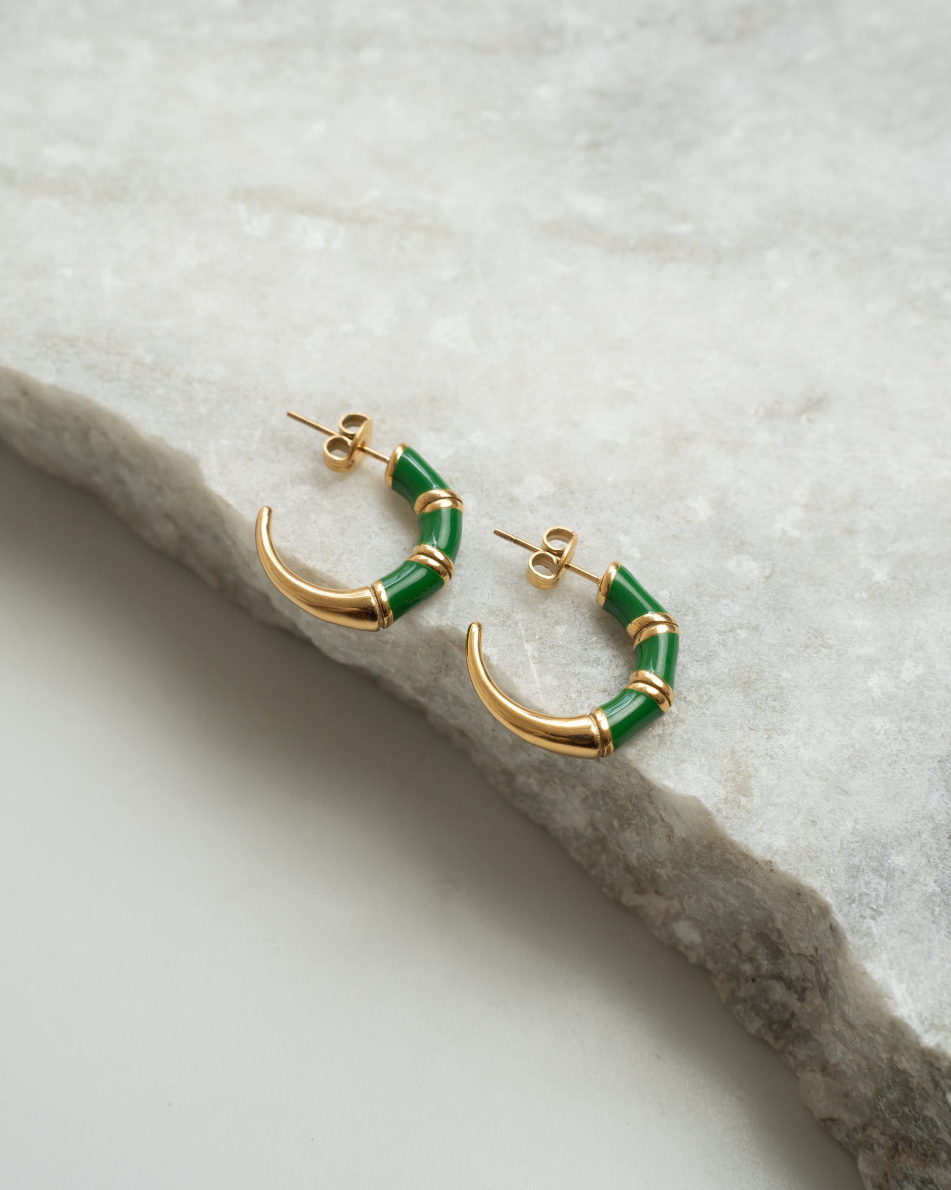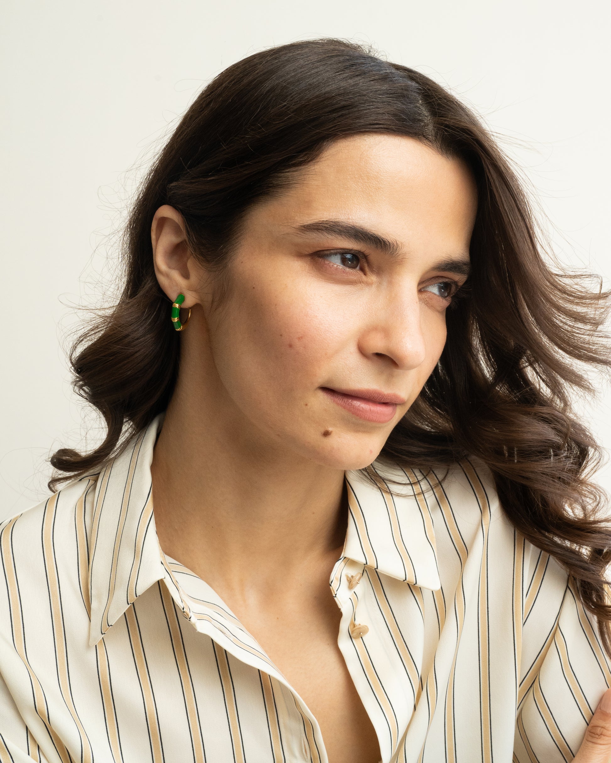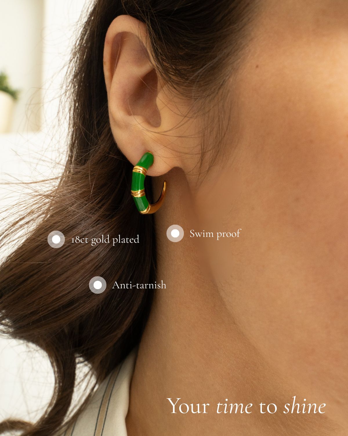 The green claw earrings feature a sleek gold finish with bold enamel detailing. Extra light & easy to sleep in.