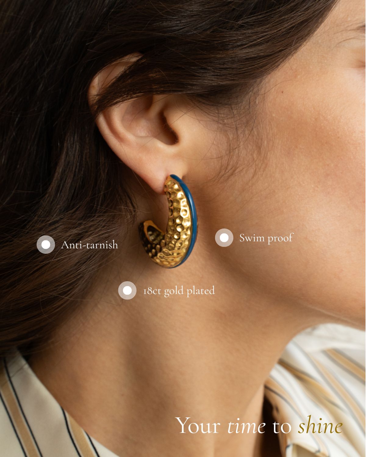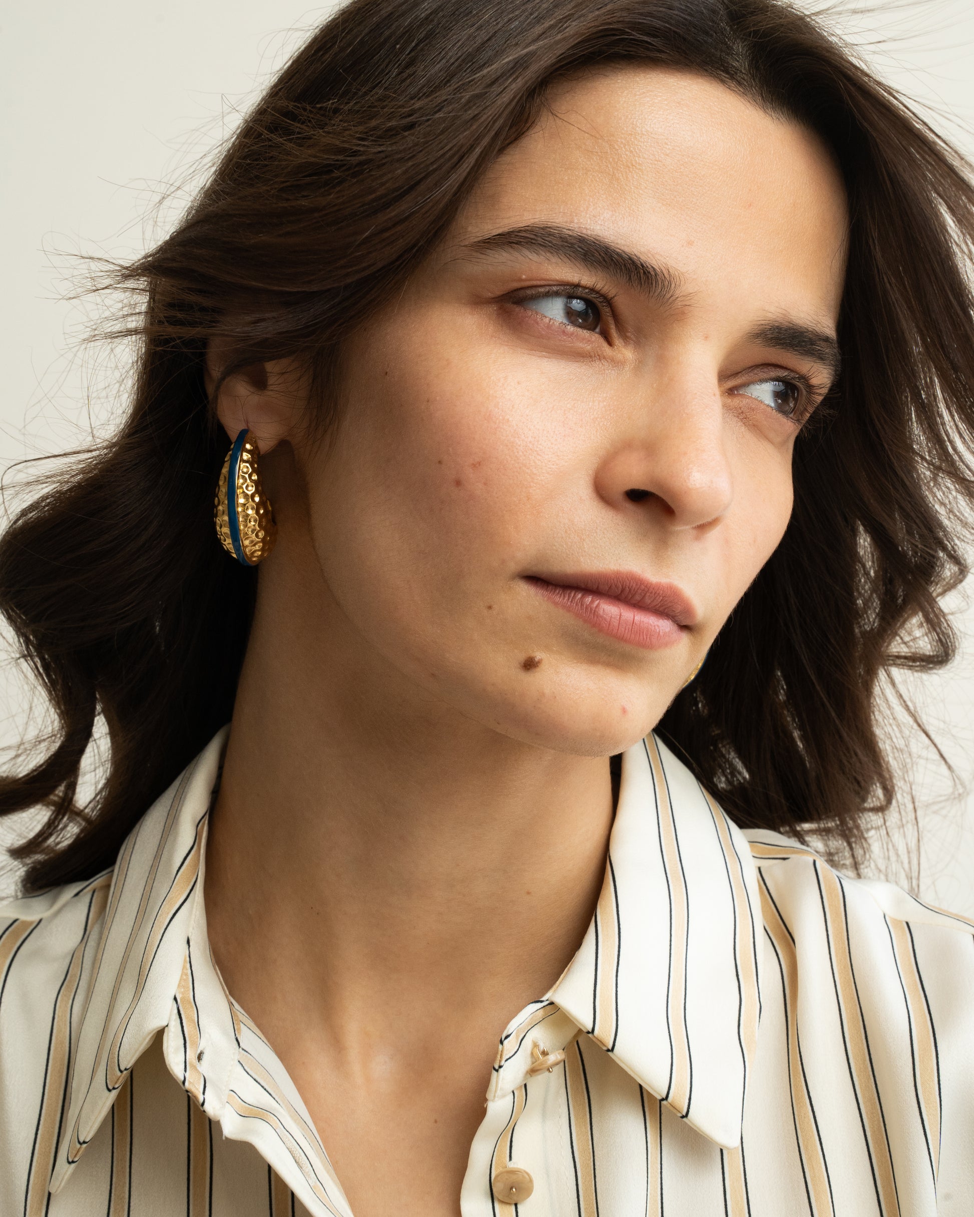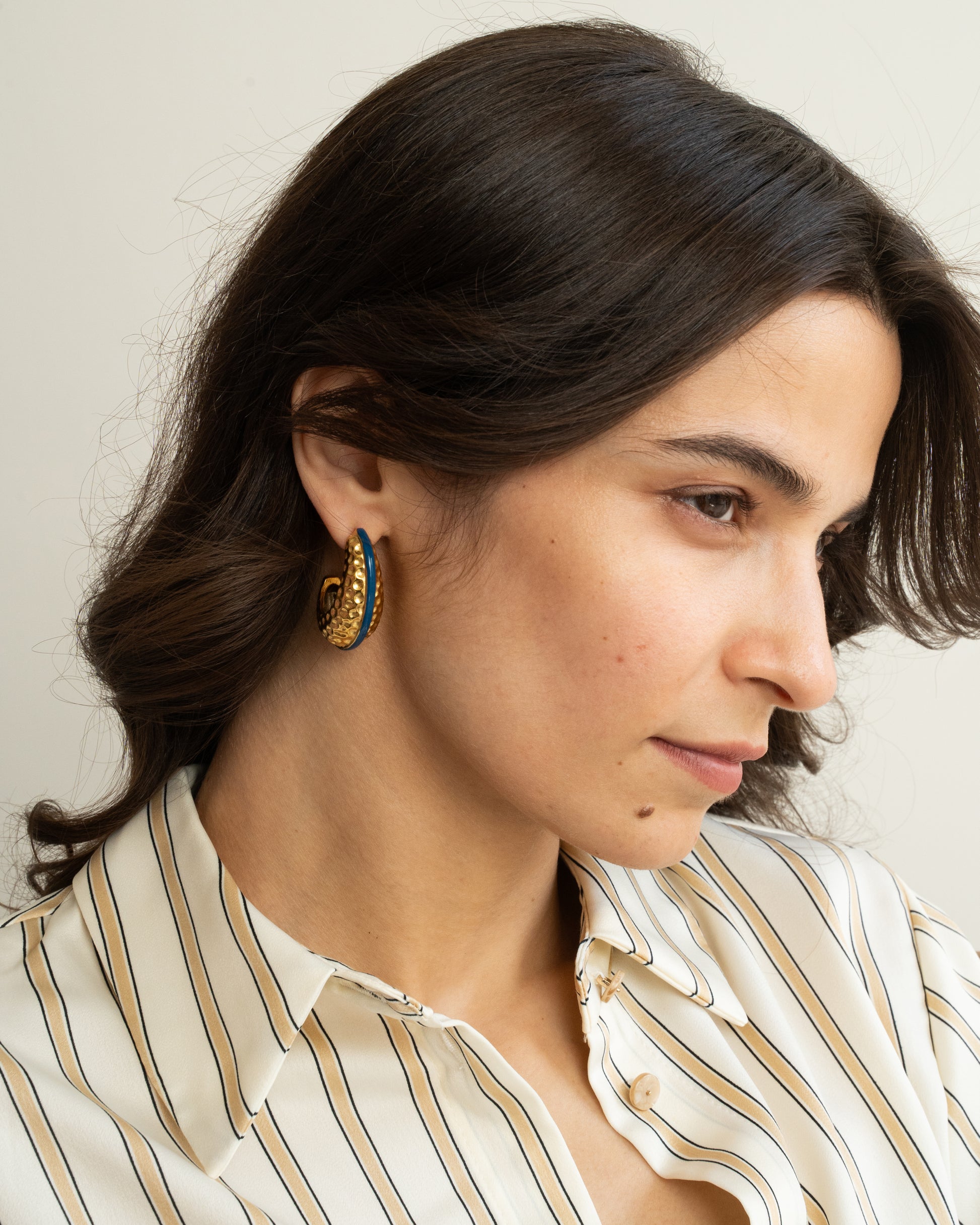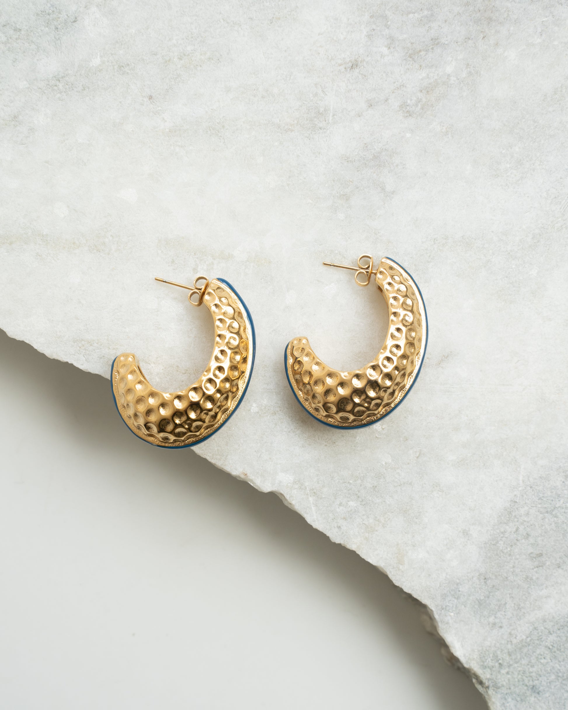 The hammered hoops feature two hammered halves set together with a navy enamel accent.