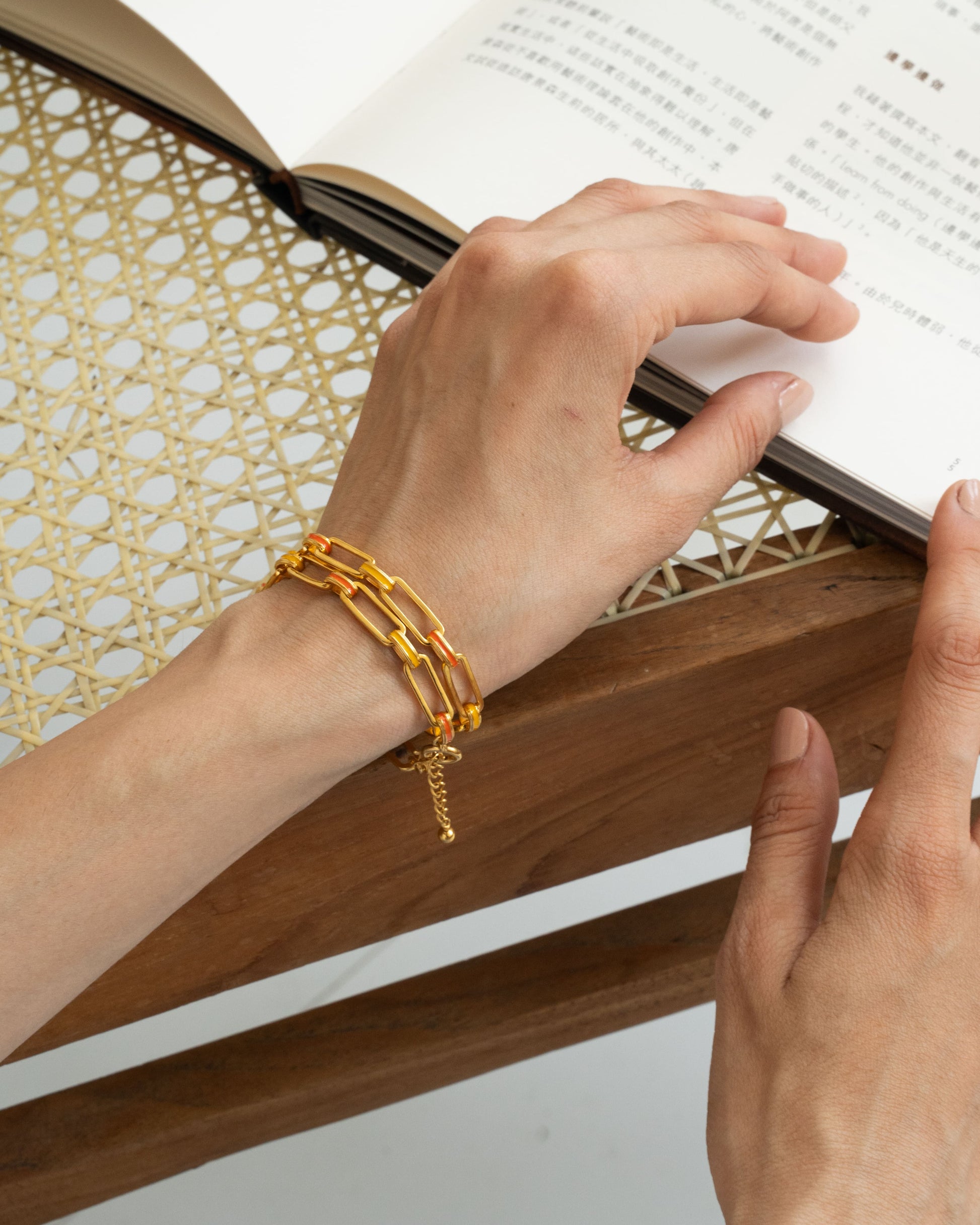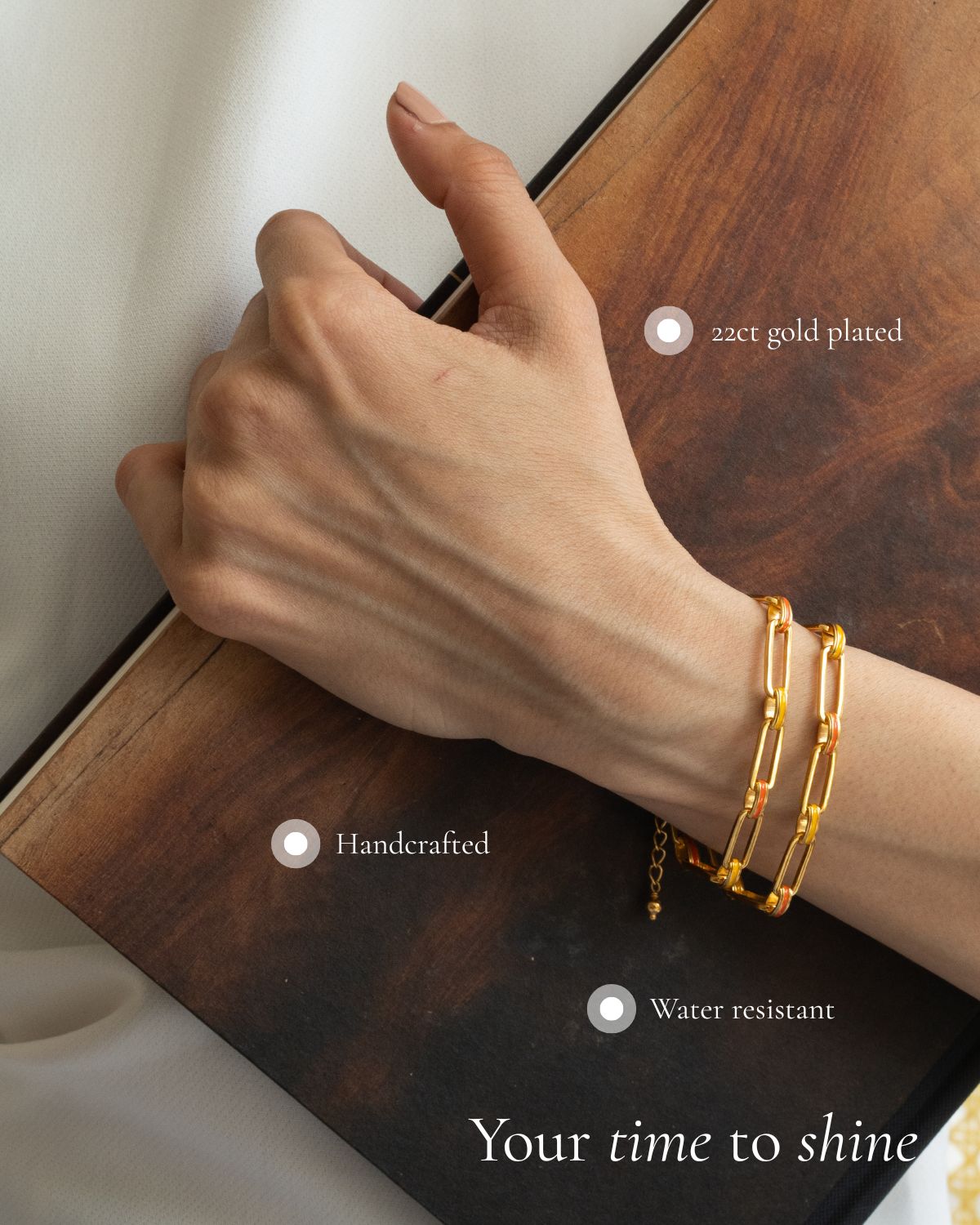 The Sunset link bracelet is a mesmerising yellow-orange combination set between gold plated links.