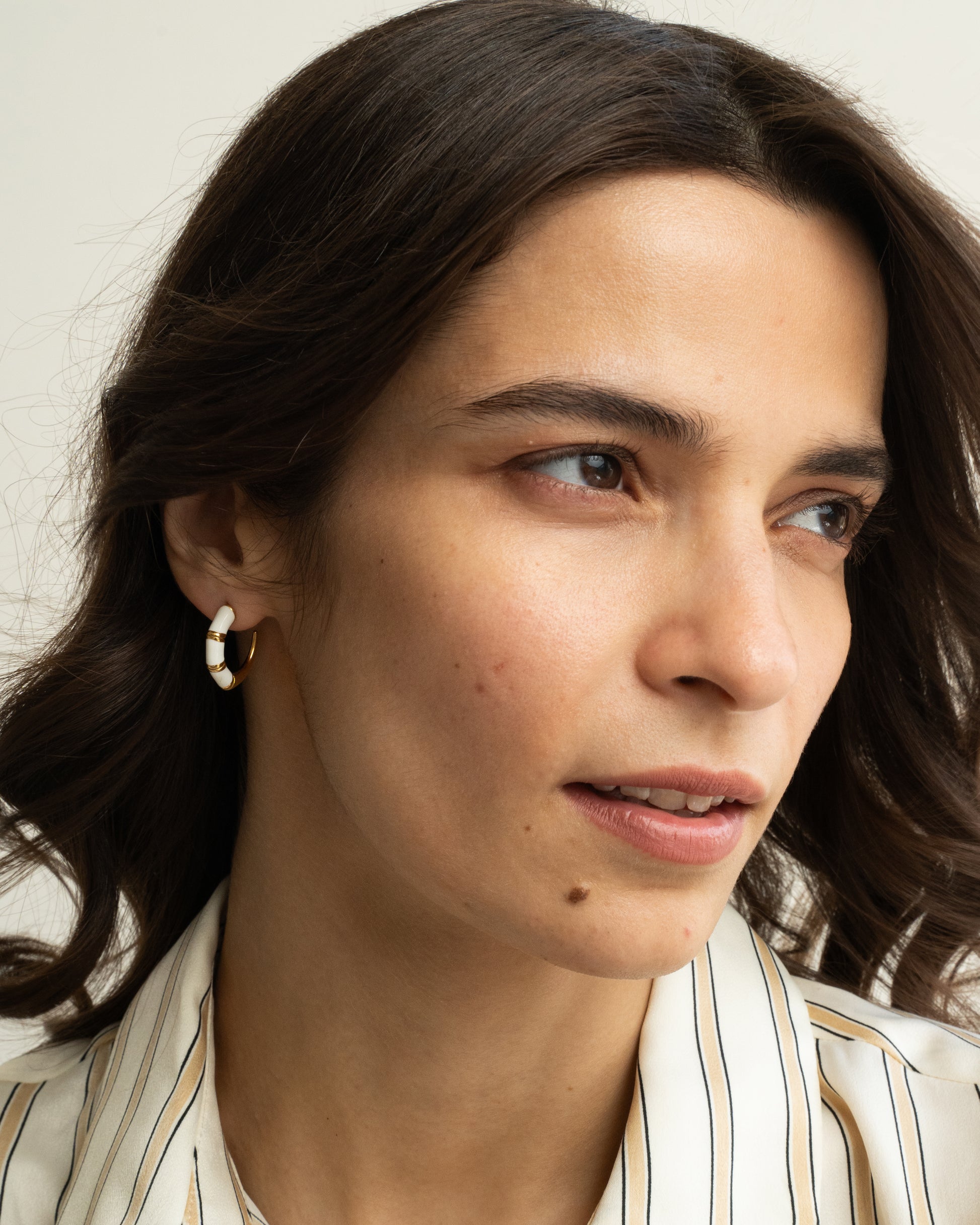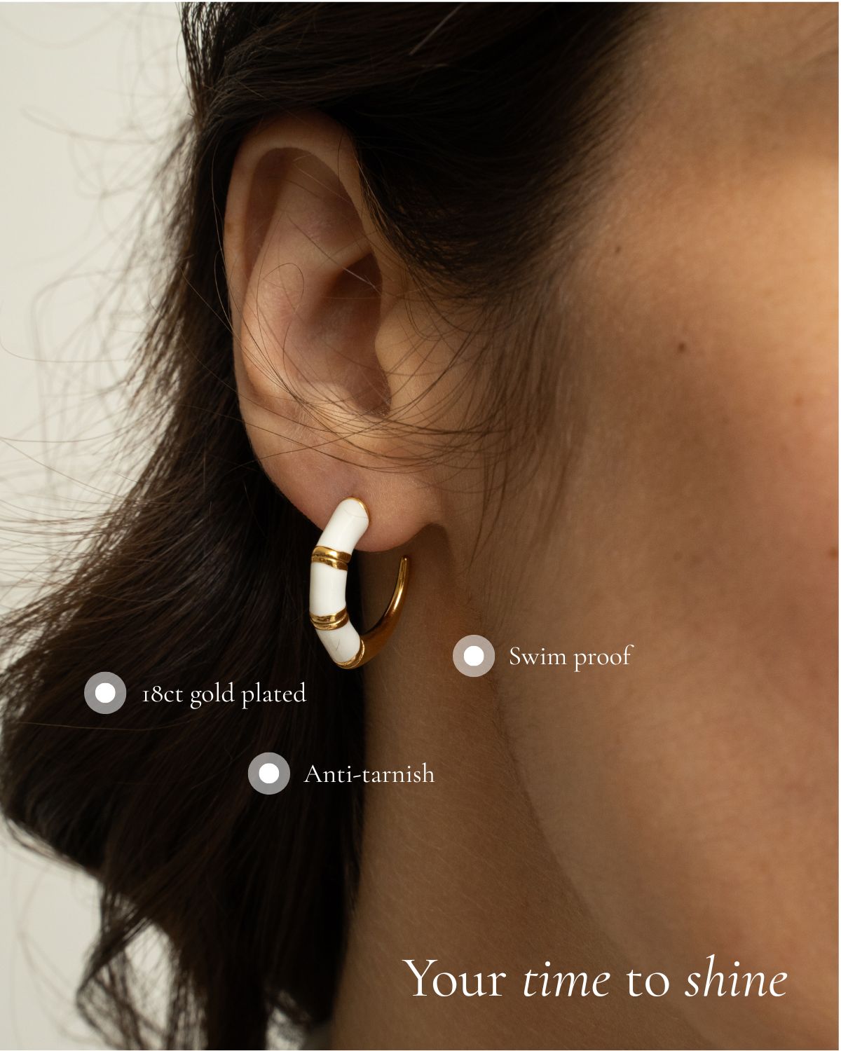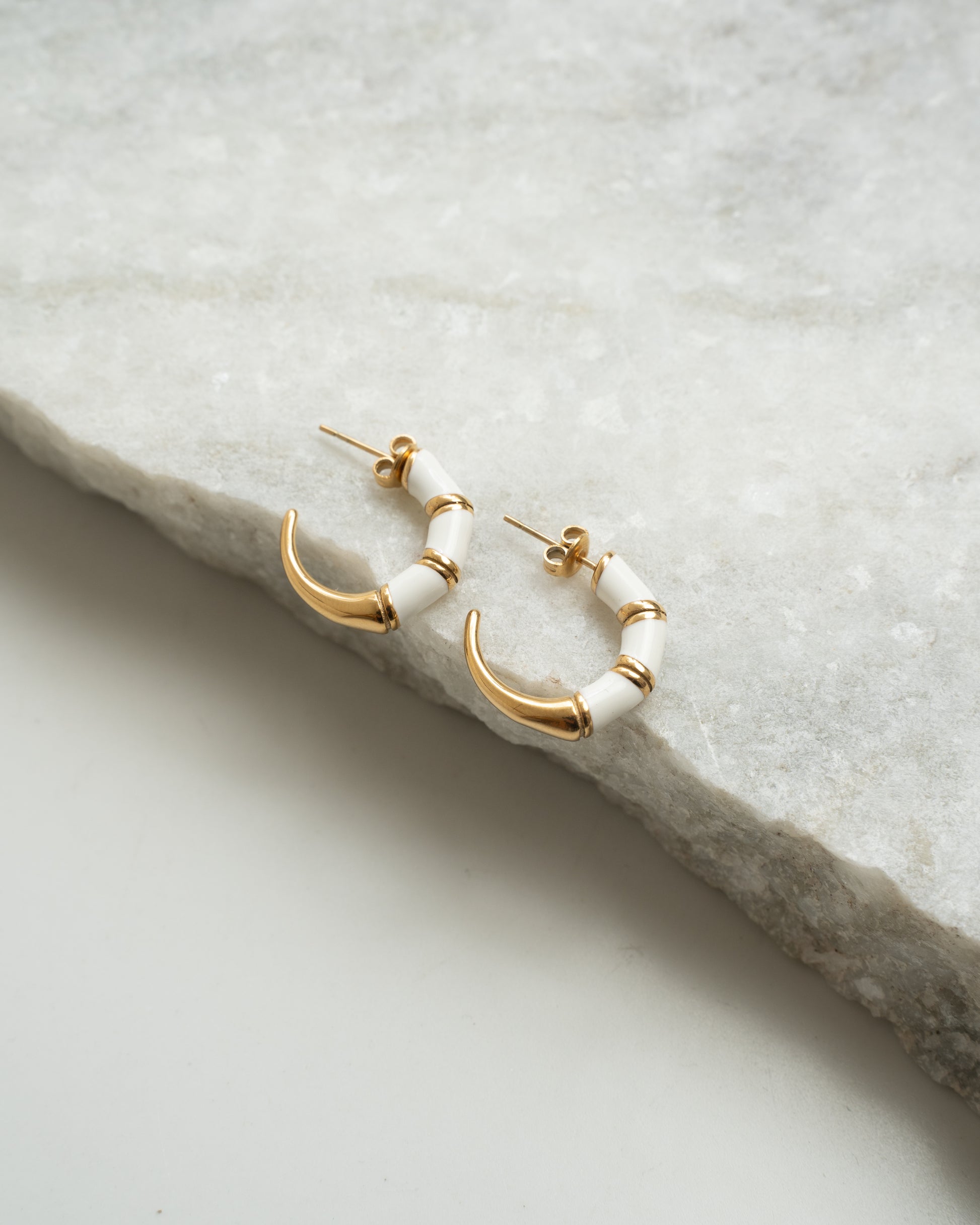 The white claw earrings feature a sleek gold finish with bold enamel detailing. Extra light & easy to sleep in.